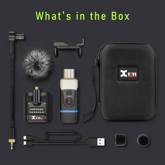 Whats in the box: U9 system, microphone, saxophone/Trumpet Clip, carry case, Type-C charging cable, fur windshield, foam windscreen,manual
