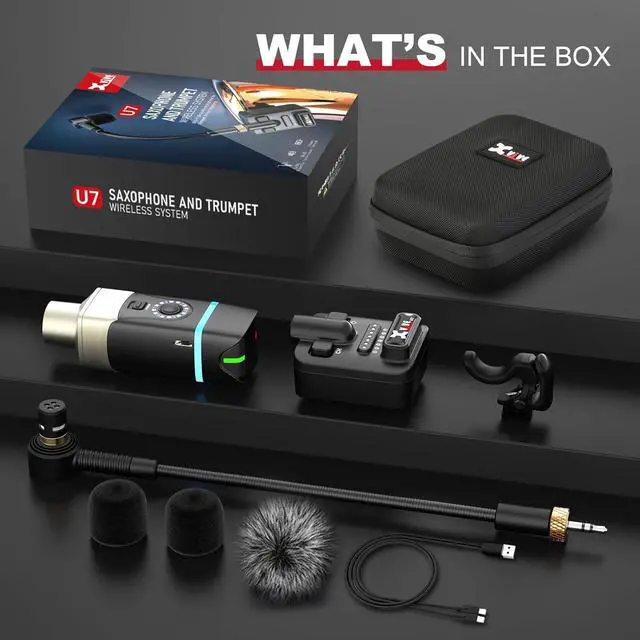 What's in the box Xvive U7 Transmitter x1, U7 XLR Rerceiver x1, Microphone X1, Fur WindshieldX1, USB Cable x1, Case x1