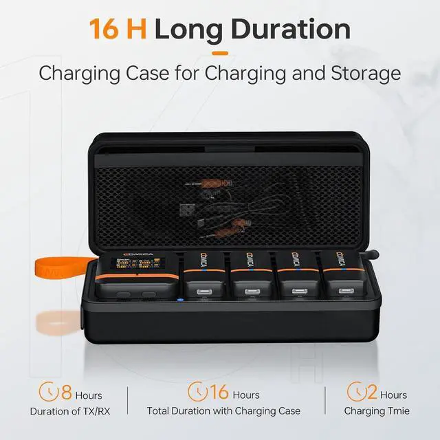 Convenient Charging & Storing Case, 16-Hour Duration: The Vimo Q wireless microphone comes with a convenient charging case, ensuring easy portability. Each transmitter boasts 8 hours of battery life, providing a total battery life of up to 16 hours for extended and uninterrupted recording sessions.