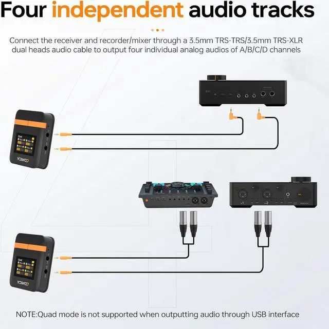4-Transmitter Wireless System: Vimo Q supports Mono/Stereo/Quad 3 audio output modes. In Mono/Stereo mode, audio signals can be output as mixing audio track. In Quad mode, each audio signal can be output as an individual audio track and edited independently during post-processing to meet users' needs for high-quality audio production.Ideal for group recordings, presentations, conferences, interviews, and dynamic video shoots.