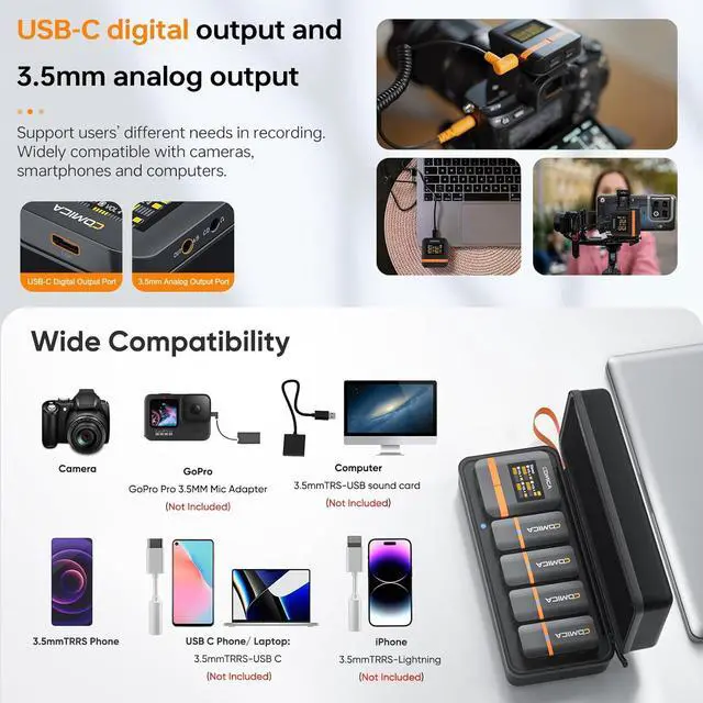 Universal Compatibility with Effortless Switching: Seamlessly toggle between USB-C digital and 3.5mm analog outputs to meet diverse recording requirements. The Comica Vimo Q wireless microphone system effortlessly adapts to cameras, smartphones, and computers, ensuring hassle-free and universal compatibility for all your recording needs.