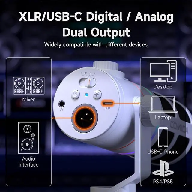 High-standard recording and multi-interface outputThe streaming microphone has 48kHz/24bit recording standard, built-in high-quality sound card, supports XLR/USB-C digital and analog dual output, and is widely compatible with multiple devices.