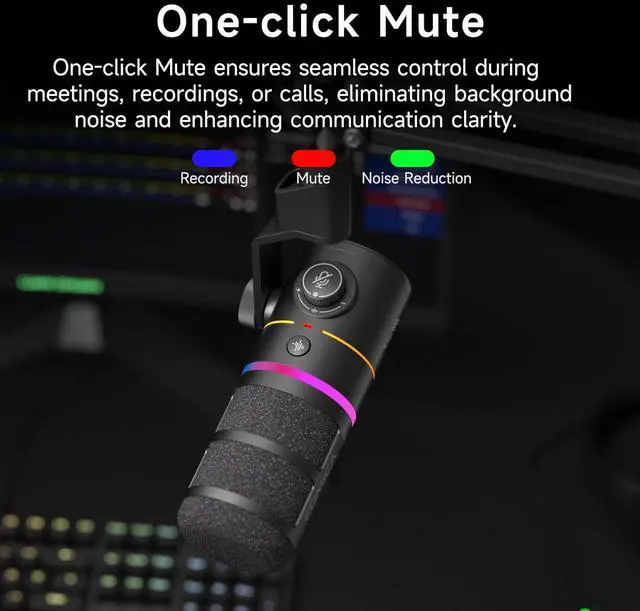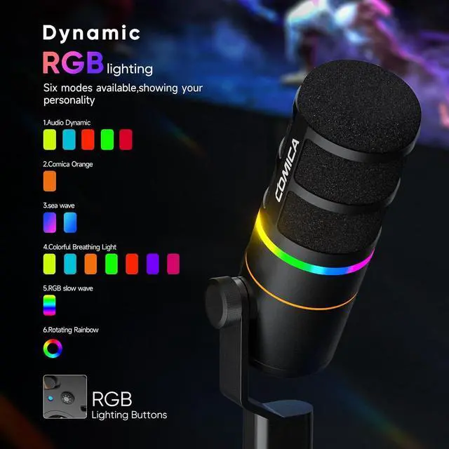 Dynamic Radiant RGB LightShort press to adjust Audio Dynamic/Comica Orange/ Sea Wave/Colorful Breathing Light/RGB Slow Wave/Rotating Rainbow six RGB light effects. Vibrant RGB lights ignite an incredible live stream atmosphere. Short press to switch bass, nature or bright three kinds of EQ effects, this RGB dynamic mic bringing you different gaming and streaming experiences.