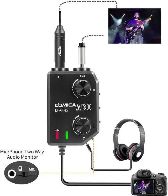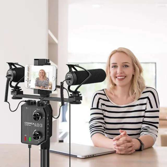 Universal for Smartphones and CamerasLINKFLEX AD3 mic audio mixer is an easy solution to connect any professional microphones or instrument to iPhone,iPad,Android Smartphones and Camcorders and DSLR Cameras.