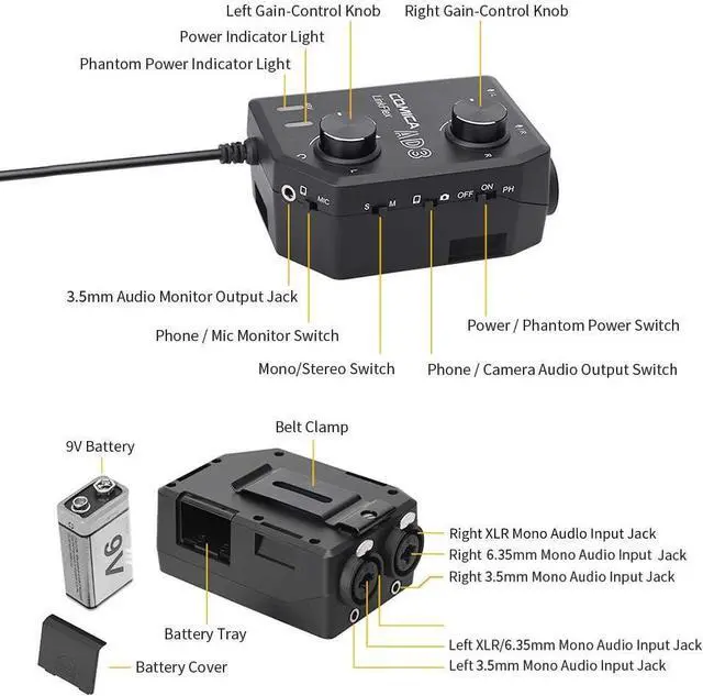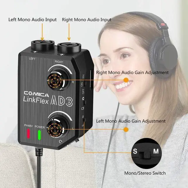 Support 2-Channels Audio InputComica LINKFLEX AD3 mic audio preamp supports mono or stereo audio input.You can record two separate tracks at the same time.NOTICE:When there is only one group microphone connected with this device, then you have to set the M/S to Mono mode.