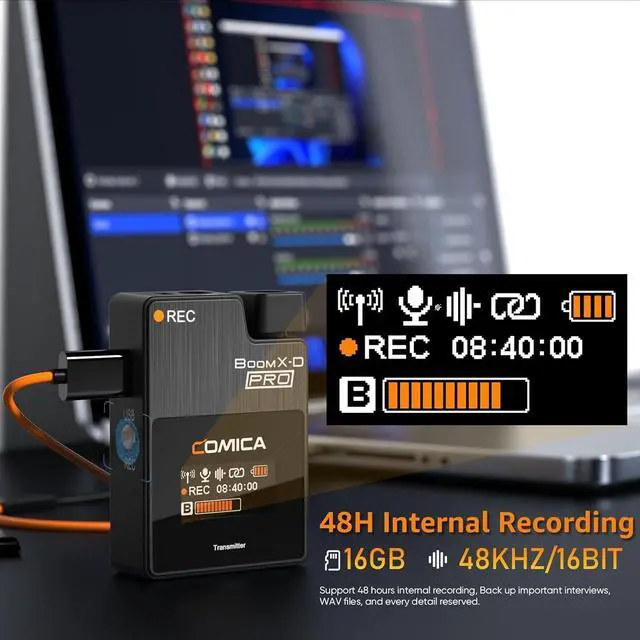Internal Recording with 16GB Memory: The Comica BoomX-D Pro wireless microphone enables direct recording to its integrated 16GB memory.As the memory reaches capacity, it seamlessly overwrites older files, ensuring dependable and effortless recording.