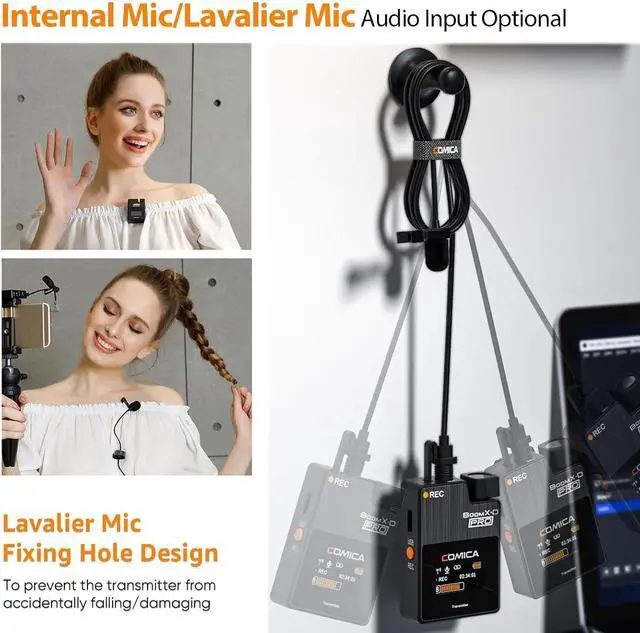 Internal and Lavalier Mic Versatility: The Comica BoomX-D Pro microphone provides the flexibility to use either the built-in internal microphone for convenience or connect an external Lavalier microphone for discreet and high-quality audio capture. Choose the best option to suit your specific recording needs.