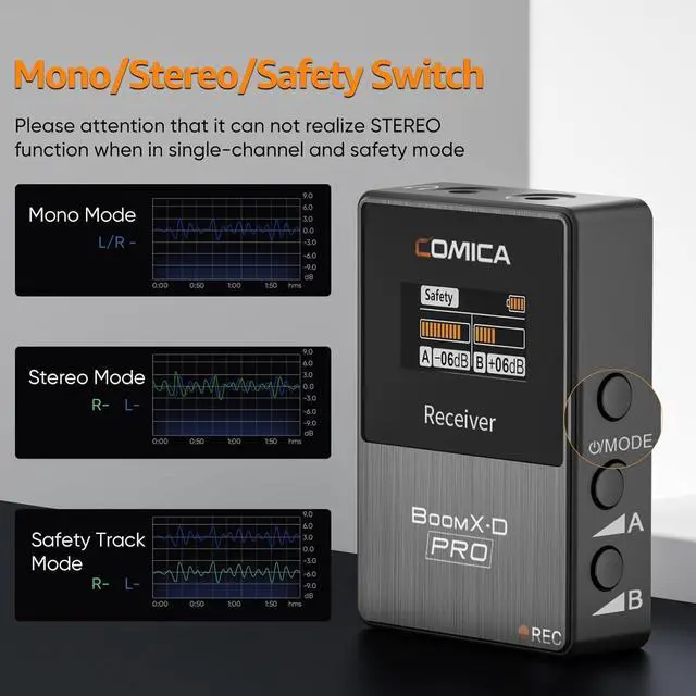 Mono, Stereo, and Safety Track Output: The Comica BoomX-D Pro wireless mic offers versatile audio output choices, allowing you to switch between mono and stereo modes to adapt to your recording scenarios. Additionally, activate the safety track mode to include a -6dB audio track for post-production, ensuring ultimate flexibility and audio control.