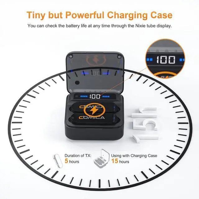 656ft Wireless Transmission and 15HR Battery Life: Comica Vimo S smartphone wireless microphone can transmit audio consistently for nearly 656 feet (in an open space) with less than 20ms of latency, making recording over long distances worry-free. The Battery case of this mic can be used for up to 15HR and the duration time of the transmitter is 5HR.
