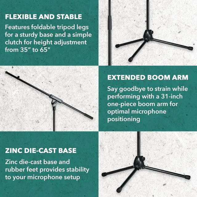 TRUSTED DESIGN: A zinc die-cast tripod base with rubber feet provides a solid foundation for your mic (not included). Folding legs set up, break-down and transport effortlessly. Designed to be a go-to stand it provides years of service at a great value!