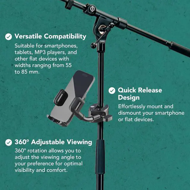 Long-Lasting Stability: Constructed from superior plastic and steel, the phone holder for mic stands is built for durability and extended use. The zinc die-cast tripod base with rubber on the feet of the microphone stand ensures reliability.
