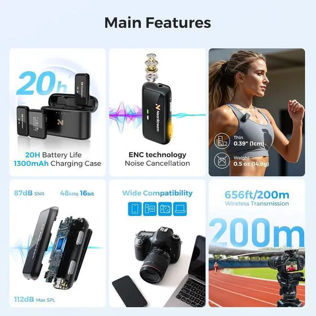 One-Click Noise Canceling for Clearer Sound: The wireless lapel mic features professional ENC technology and enhanced firmware with intelligent audio algorithms. The clip-on microphone wireless can filter out the environmental noise, ensuring crystal-clear sound quality. Additionally, the included windscreen on the wireless microphone for cameras further minimizes background noise.