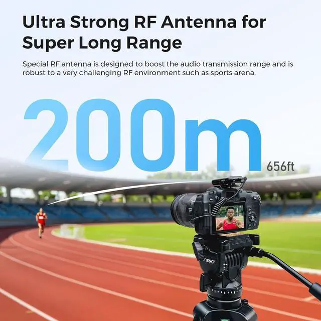656ft/200m Wireless Transmission: The AWM20T wireless microphone utilizes advanced 2.4GHz digital transmission and near-zero latency via a specialized codec, ensuring a stable range of up to 656ft in open, unobstructed environments. (Note: Transmission range may be affected by obstacles such as metal and interference from certain wireless devices.)