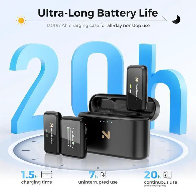 20H Battery Life & Volume Control: The streaming microphone's transmitter offers 7 hours of battery life, with the podcast mic's receiver lasting 6 hours. Extend usage up to 20 hours with the charging case. The podcast microphone's receiver features 3 adjustable audio gain levels, and the recording microphone's transmitter has a mute button indicated by a red light. Ideal for outdoor activities, podcasting, vlogging and streaming.