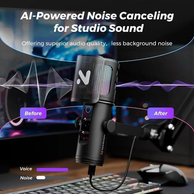 Crystal Clear Sound with Noise Canceling On/Off: Experience studio-grade audio with this studio microphone, equipped with AI-driven noise reduction that can be easily activated or deactivated via a double-click. Engineered for accuracy, it delivers pristine sound capture within a 15.75-inch range, complemented by an integrated pop filter for smooth, distortion-free voice reproduction. Its cardioid polar pattern focuses on front-facing sound while minimizing background noise.