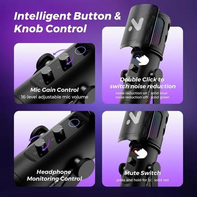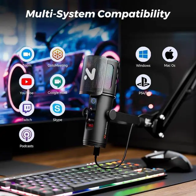 8-Mode Controllable RGB Lighting & Quick Mute: This PC microphone with boom arm offers 8 customizable RGB lighting modes. A quick press cycles through the colors, and after all 8 modes, the next press turns the lights off, letting you match your setup's vibe and elevate your livestreaming. For instant mute/unmute, simply hold the button for 1 secondred light means muted.
