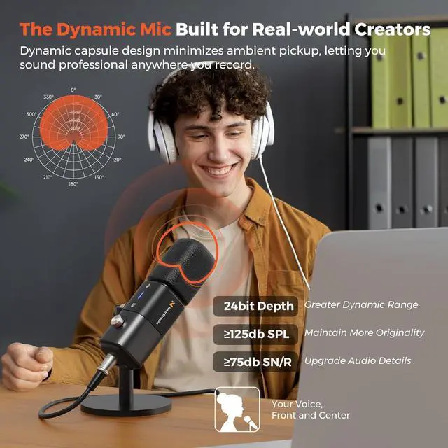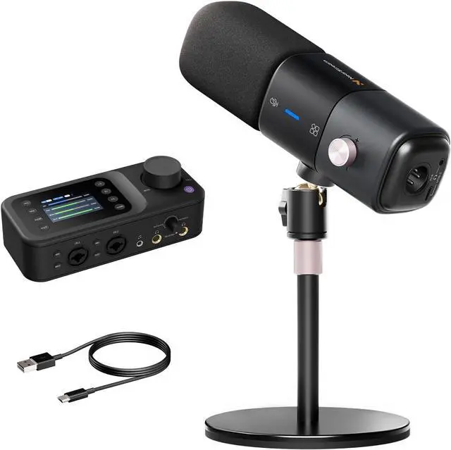 [All-in-One Podcast Bundle]: The dynamic microphone and audio interface work together to deliver rich, natural sound. Designed for true plug-and-play convenience, this bundle offers quick setup and intuitive controls for effortless sound adjustment. Ideal for podcasters, streamers, and creators who want professional-quality audio made simple.