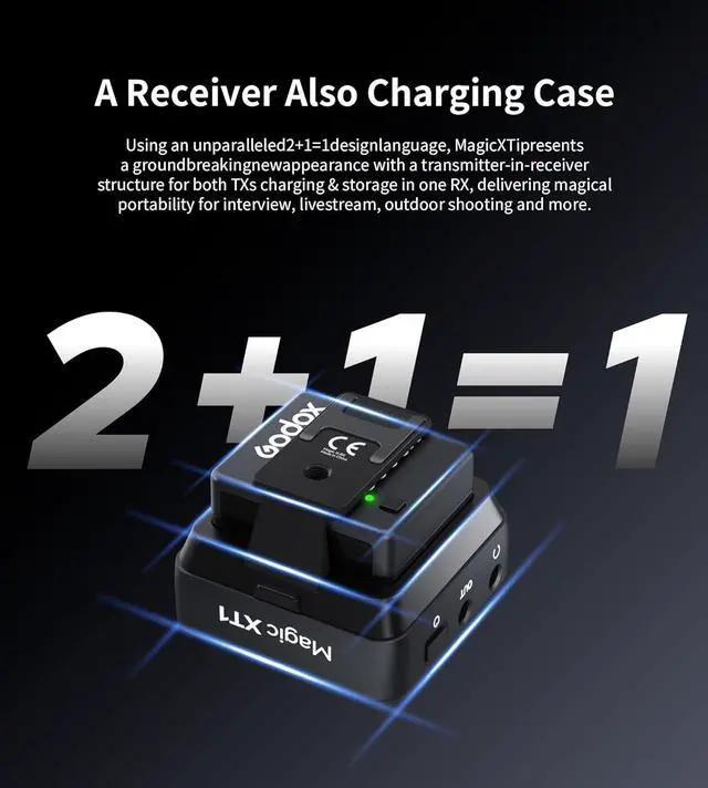 All-powerful versionUsing an unparalleled 2+1=1 design language, Magic XT1 presents a groundbreaking new appearance with a transmitter-in-receiver structure for both TXs charging & storage in one RX, delivering magical portability for interview, livestream, outdoor shooting and more.