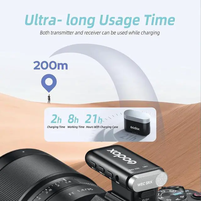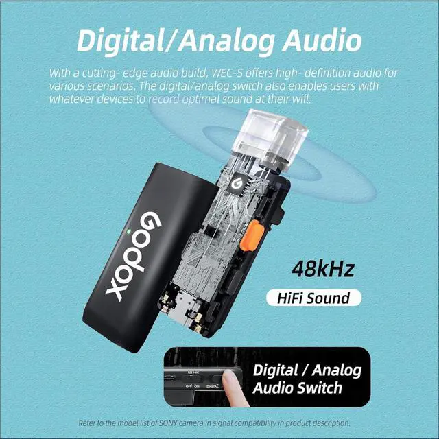 Digital/Analog AudioWith a cutting-edge audio build, WEC-S offers high-definition audio for various scenarios. The digital/analog switch also ensures users with whatever devices to record optimal sound at their will.With a high-gain, interference-resistant 2.4GHz antenna, WEC-S supports up to 200m line-of-sight transmission distance, giving freedom to your content creation.