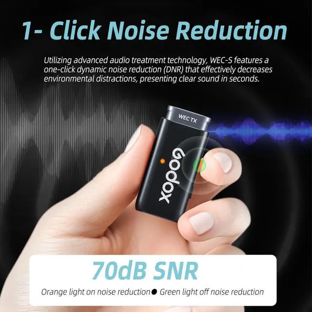 12g Super Lightweight TXWeighing a mere 12g on the transmitter, WEC-S presents a burden-free audio solution with an excellent wearing experience. With a one-click dynamic noise reduction (DNR) function, WEC-S effectively decreases environmental distractions, bringing crisp sound in seconds.