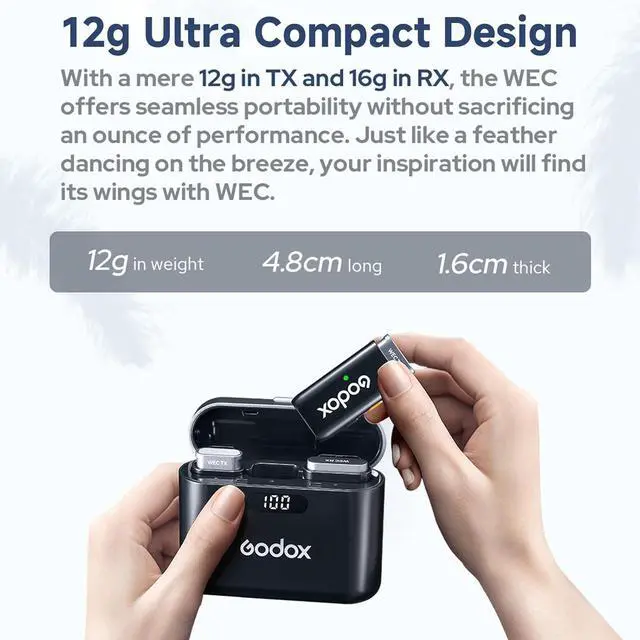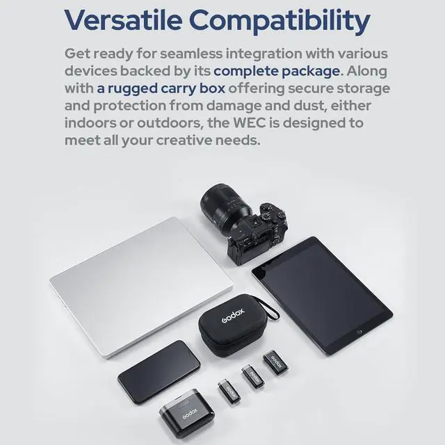 Wide Compatibility - GODOX Wireless Lavalier Microphone with included 3.5mm TRS and TRRS cables, 3.5mm to Lightning cable is also included.The Godox WEC Kit2 also compatible with multiple devices such as smartphones, tablets, cameras, recorders.