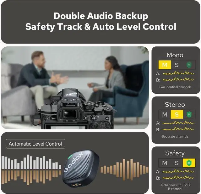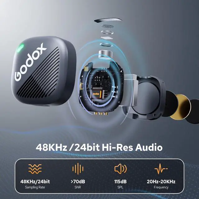 DOUBLE-MODE NOISE CANCELLATIONGODOX Cube-C wireless microphone features DOUBLE-MODE noise cancellation. Whether you're in a noisy coffee shop or a windy outdoor spot, just press a button to pick the best noise-canceling level. it ensures a seamless audio experience for all your recordings or communications.