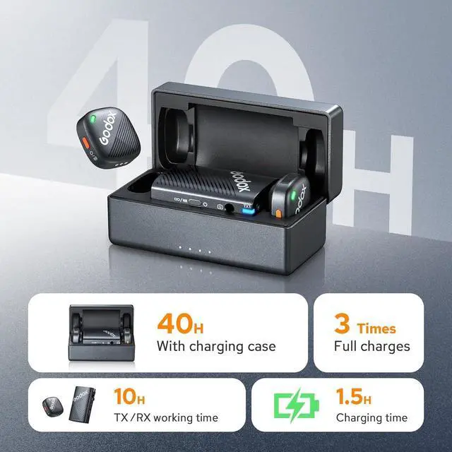 40 HOURS BATTERY LIFE GODOX Cube-C microphone Each TX and RX exhibits 10 hours, The compact charging case can recharge the entire set 3 times. With the charging case, the total battery life extends to 40 hours, No worry about running out of power by usage.