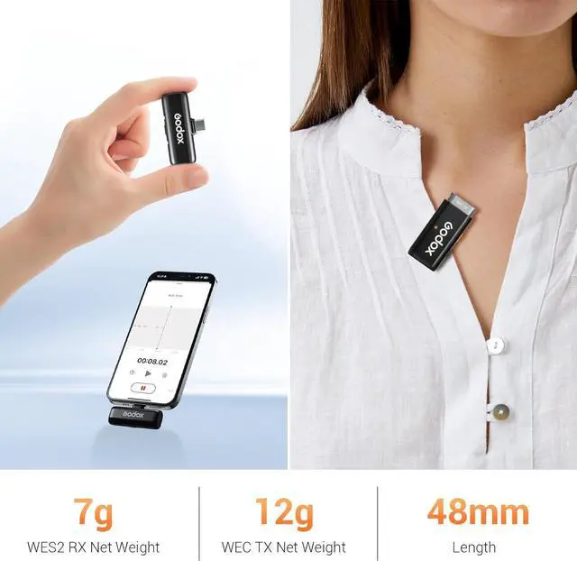Incredible LIGHTWEIGHT and CompactGODOX WEC wireless microphones TX weighs only 0.42oz/12g, lighter than 3pcs of A4 papers, RX weighs only0.24oz/7g, None-feeling wear experience.
