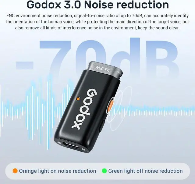ENC Environmental NOISE CANCELLATION- GODOX WES wireless lavalier microphone features Advanced Noise Reduction Technology, which provides effective environmental noise cancellation, and makes your video voice clear and clean.
