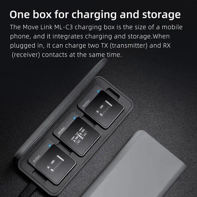 Integrated storage and charging The charging box is about the size of a mobile phone, and there are 3 charging bases inside, which can be stored and charged