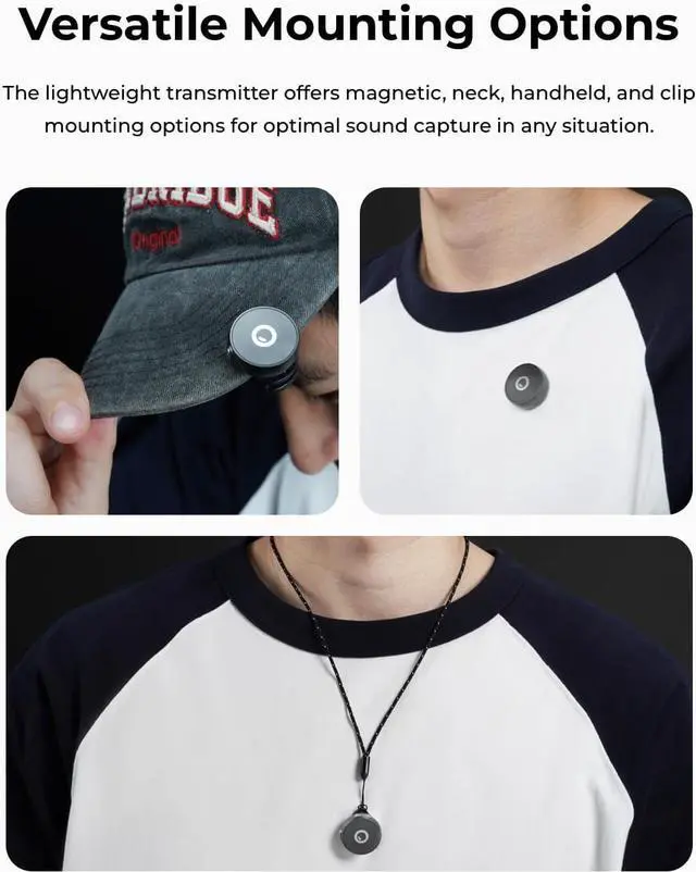 Versatile Mounting OptionsThe 7.9g button-sized transmitter combines elegance with comfort, offering versatile wearing optionsmagnetic, neck-mounted, handheld, clip-styleall designed for optimal sound capture in any situation.