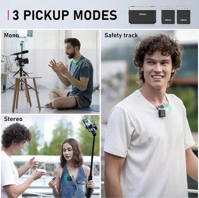 High-Quality AudioUlanzi wireless lapel microphone comes with a 48kHz sampling rate, capturing every detail and nuance with stunning clarity. Features Three pickup modes - Mono Mode: Accurate frequencies, clear and distortion-free. Stereo Mode: High-fidelity and immersive, professional audio. Safety Track Mode: Backup audio track, helping to safeguard your audio in case of unforeseen level spikes.