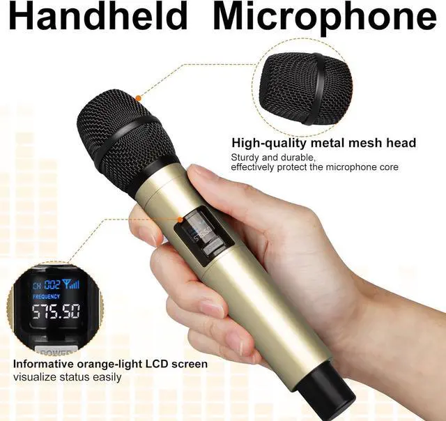 165 FT RANGE&STABLE SIGNALCordless microphone and receiver use advanced connection technology to support transmission distance of up to 164 feet. Multi-channel high-frequency selective filtering can completely eliminate interference signals., If multiple microphones are used at the same time or there is noise, the HD LCD screen displays power and frequency band information.