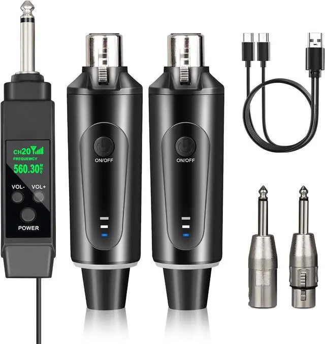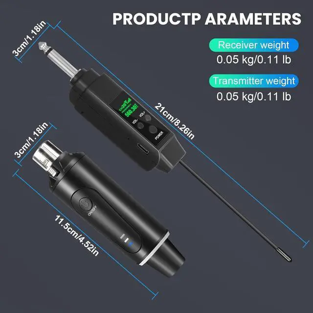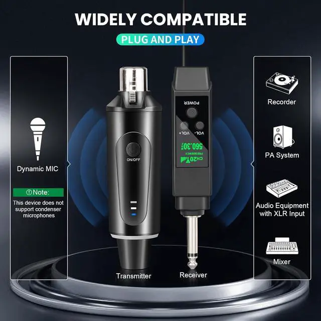 XLR transmitter and 6.5MM receiver, Suitable for dynamic microphone , mixer, PA system, providing stable and reliable wireless transmission.