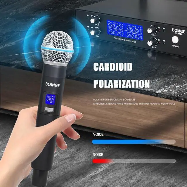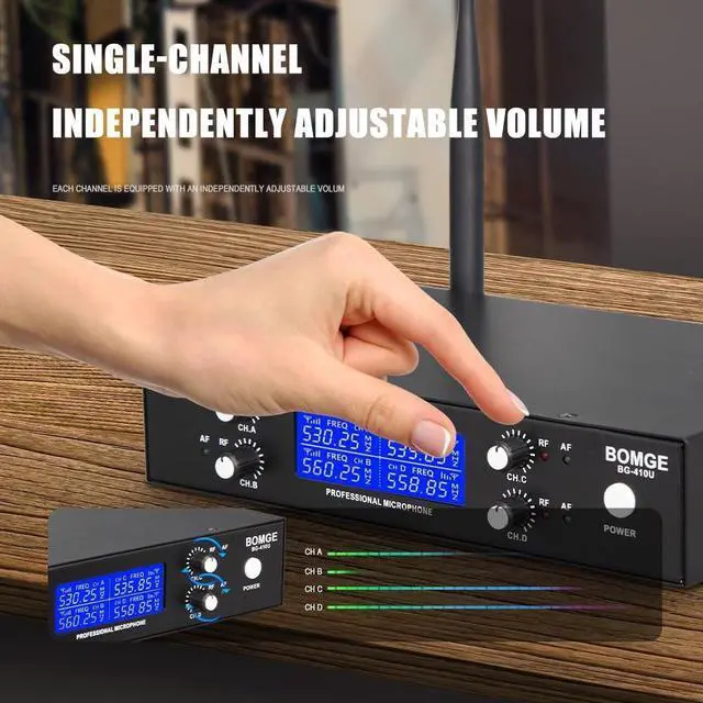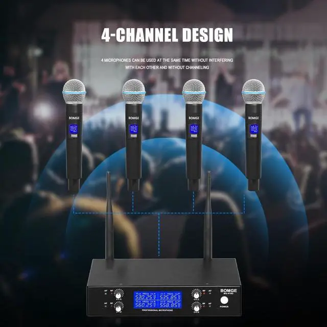 BEYOND-EXPECTATION WIRELESS PERFORMANCE: 4-channel microfono inalambrico set has fixed frequency design in UHF, providing ultra signal stability, eliminating unwanted distortion. The professional receiver with four wireless mics has LCD displays showing frequency number, and has individual volume control enabling precise vocal balancing. Up to 260ft long range reliable performance in wide open space line of sight