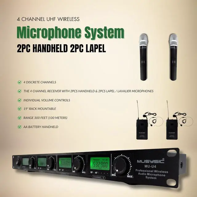 4-Channel Wireless Freedom: Experience seamless performances with up to 4 handled lapel/lavalier & headset wireless mics operating simultaneously on discrete UHF channels, ensuring interference-free versatility.