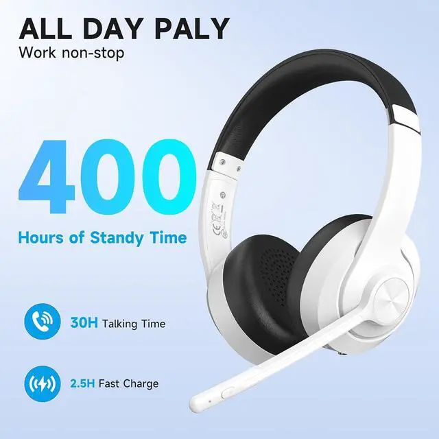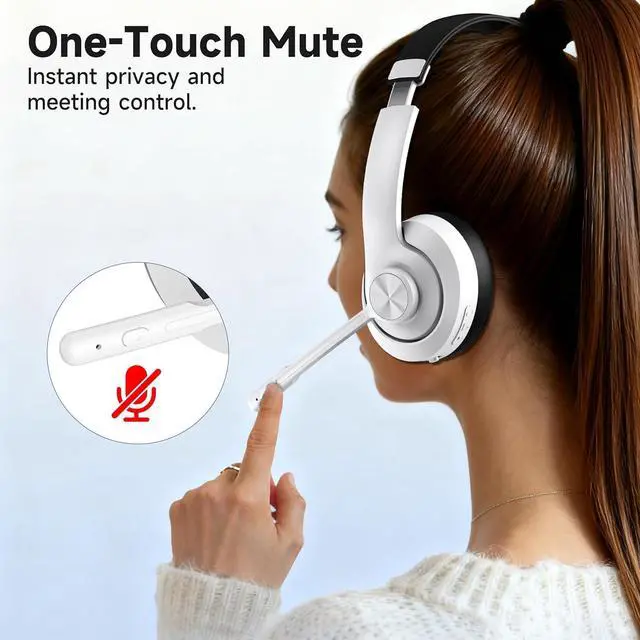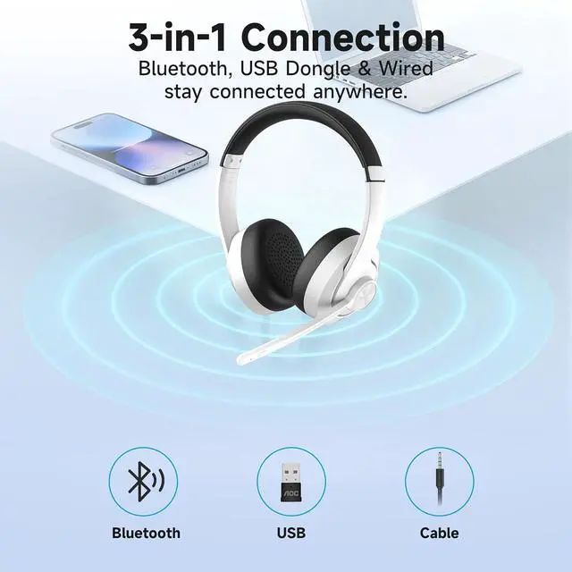 Versatile Triple Connectivity These wireless headphones with mic for work are designed for professional use, offering effortless switching between Bluetooth, USB dongle, and wired connections. Enjoy uninterrupted audio and crystal-clear calls across all your devices.