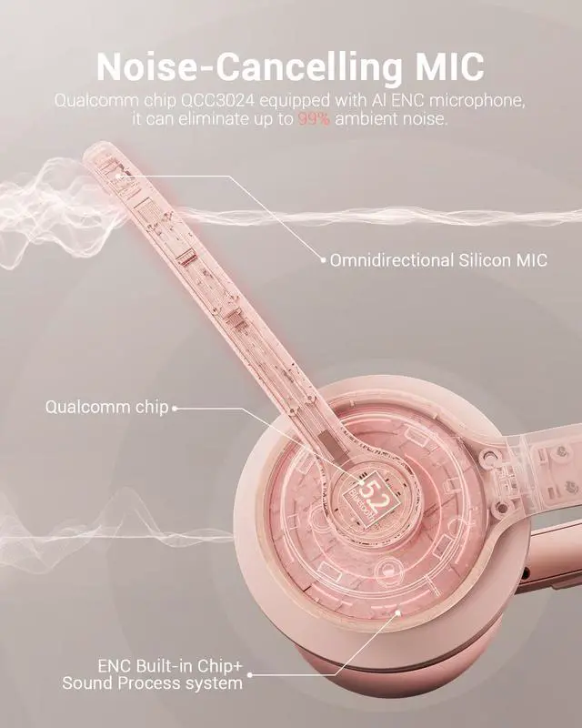 Qualcomm cvc8.0 Noise Cancelling MicrophoneJIAMQISHI EH02U wireless headset for computer Qualcomm chip QCC3024 equipped with AI environmental noise cancelation microphone, it can eliminate up to 99.99% of the ambient noise. So you can hear and be heard clearly wherever you are.
