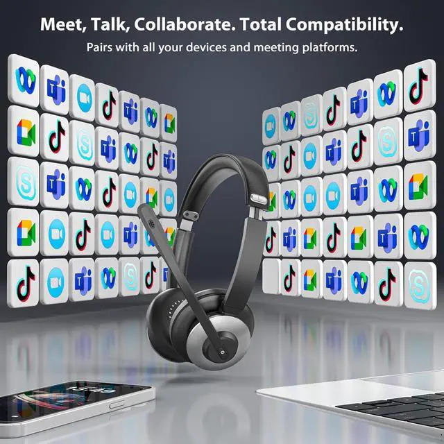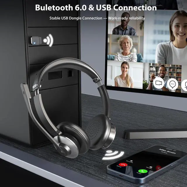 Stable Connectivity & Wide CompatibilityEngineered for uninterrupted communication, our bluetooth headphones with microphone leverage a advanced V6.0 Bluetooth chip for rock-solid, low-latency connections. They are fully compatible with major platforms like Webex, Zoom, and MS Teams. Crafted to be the perfect wireless call center headset, they ensure crystal-clear reliability for every call.
