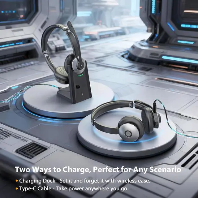 Long Battery Life & Charging DockThis wireless headset with mic for work is built for endurance, powering through up to 26 hours of talk time or 200+ hours on standby. For effortless power management, the laptop wireless headset includes a plug-and-play charging dock supporting both dock placement and a TYPE-C cable. It's the perfect companion for full office shifts and long road trips.