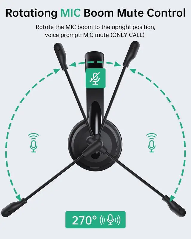 AI Noise Cancellation & Mute FunctionWireless headset with microphone for pc revolutionize your calling experience with advanced AI noise cancellation, blocking out most of background noise(NOTE: This Feature is Only Available in Bluetooth Connection Mode). Say goodbye to distractions from pets or kids during crucial discussions! Plus, simply rotate the microphone boom to the UPRIGHT position to activate the mute function, ensuring privacy during sensitive conversations or minimizing unnecessary noise