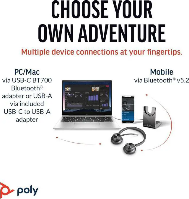 CUT THE CORD, CUT THE COSTS. Stay productive anywhere with this dual-ear Bluetooth headset, wireless headset with mic featuring all-day comfort, rich stereo sound, and up to 164 ft range via Bluetooth 5.2 or USB-C plus USB-C to USB-A adapter