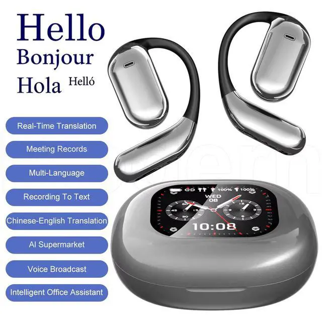 2025 New Q16 PRO AI Real-Time Translation TWS Earphones Open-Ear HD Sound LED Smart Screen Two-Way Translator for Business White