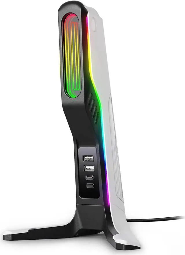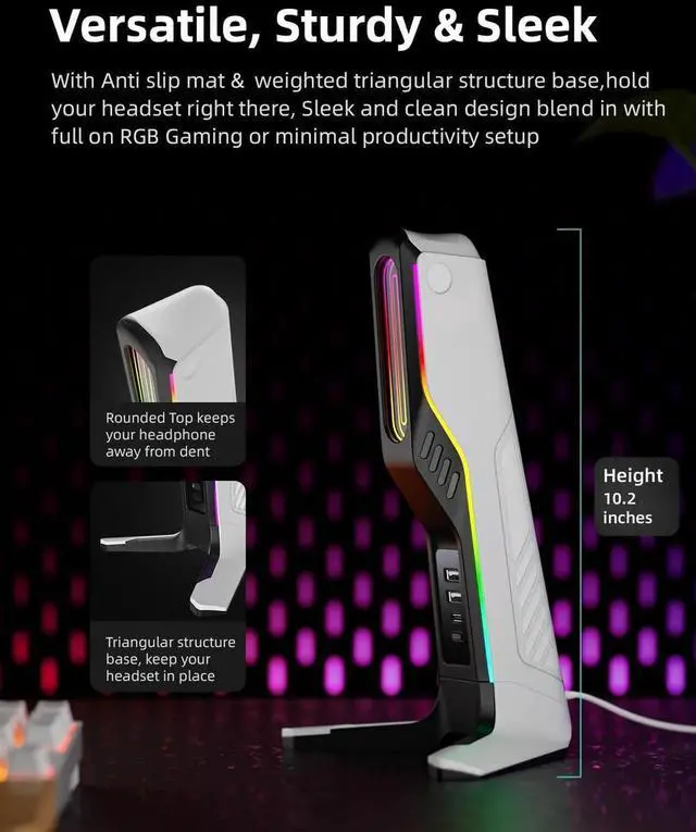 Dynamic RGB Lighting Modes: Flowing Rainbow, Colorful Breathing, Up to 5 Static colors. Allowing you to match your headset stand with your mood or game effortlessly. making it perfect for gamers, streamers, and tech enthusiasts alike.