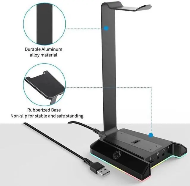 With USB & 3.5 mm Port EKSA Headset Holder is built with 2 USB ports for transferring data and files, like Windows, Linux, Mac with plug & play function. No drivers required. Perfects for Smartphones/iPad/Tablet/Fans/Powerbanks, or other smart usb devices charging. Besides, with 3 3.5 mm aux ports, can support multiple type of headphones with 3.5 mm audio jacks connection.