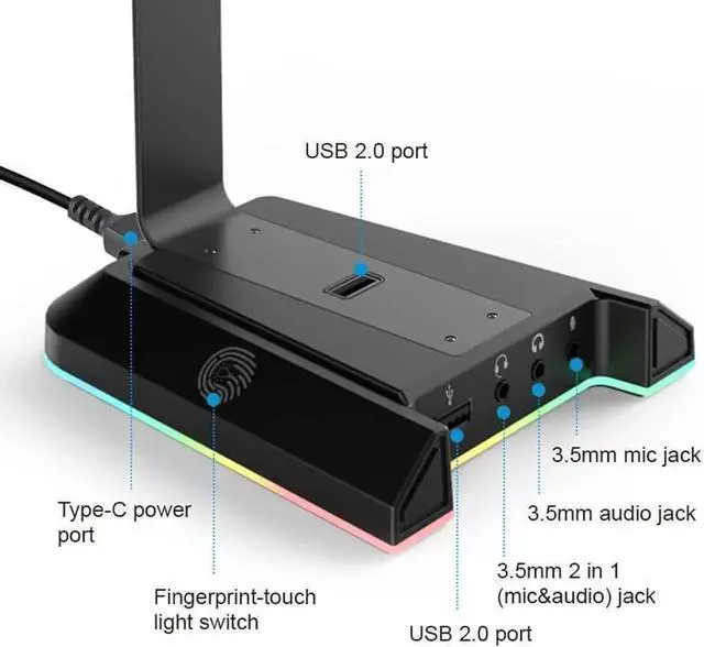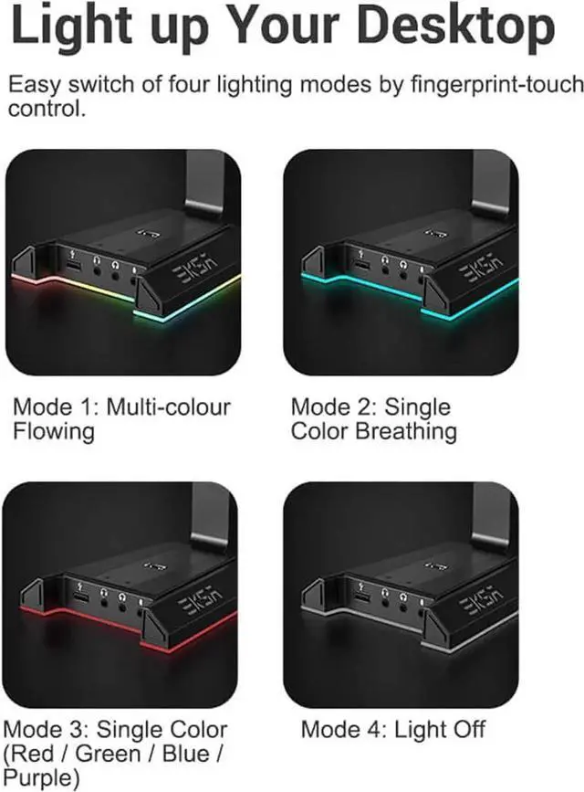 Dynamic RGB Headset Stand EKSA Gaming Headset Stand designed with 3 lighting modes, Multi-color Flowing mode, Multi-color Breathing mode, and Static Lights Mode, creating a cool gaming atmosphere. The dynamic RGB light can across 8 zones, allows different color options. You can easily change the light modes, or turn off the light by touching the Fingerprint-touch light switch.