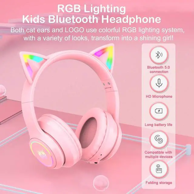 Pink Bluetooth Cat Ear Headphones for Kids & Adults, Wireless & Wired Mode Foldable Headset with Mic - Clear Sound Quality - RGB LED Light, for Girls School Gaming, for Phone/Laptop/PC/Tablet