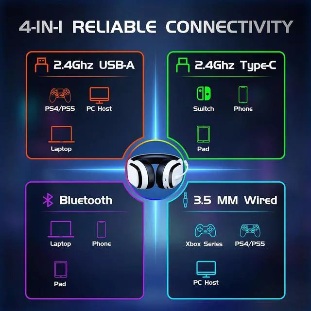 Designed for PS5 & Multi-Platform CompatibilityBuilt for serious gamers, this ps5 headset wireless delivers lossless, ultra-low latency 2.4GHz connectivity for PS5, PS4, Nintendo Switch, Steam Deck, and PC. The stable USB dongle ensures smooth, reliable wireless gaming across platforms. It also features a 3.5mm wired mode for xbox(wireless mode not supported) and a Bluetooth option for effortless connection to mobile devices (Bluetooth not supported for gaming consoles). One wireless gaming headset for all the ways you play