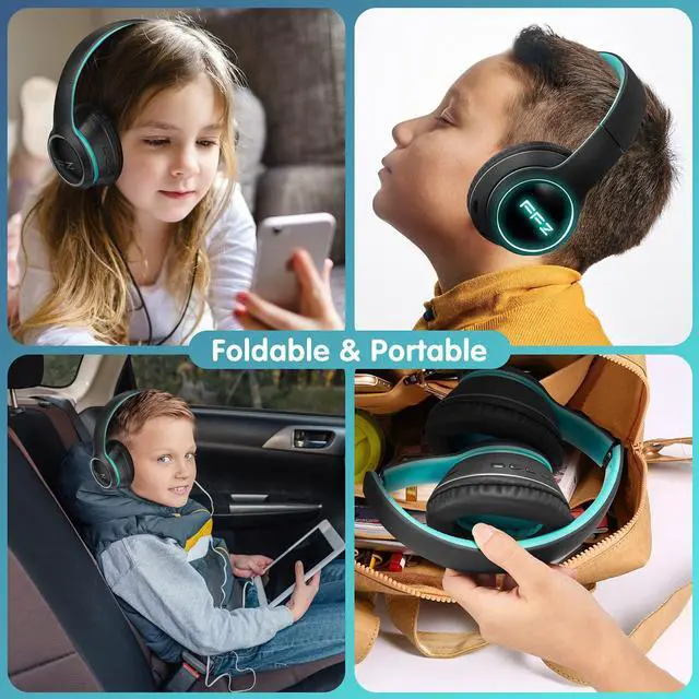 Kids Wireless Headphones, Colorful LED Lights Blue Tooth-V5.0 Headphones for Kid with Built-in Microphone, Foldable Headset & Soft Earpads, for School/Car/Airplane/Ipad(Black)