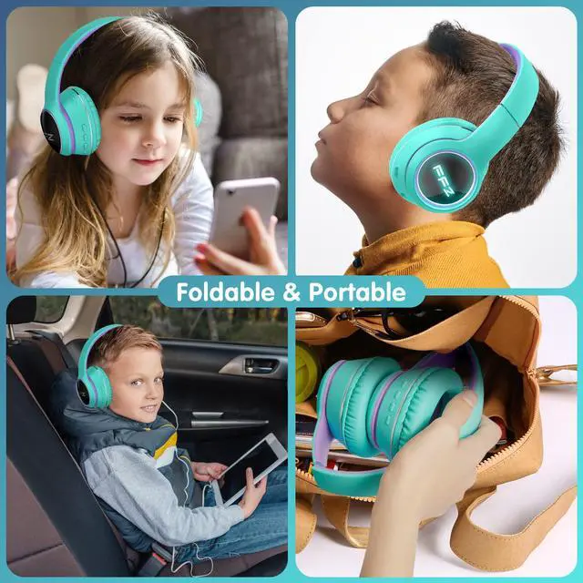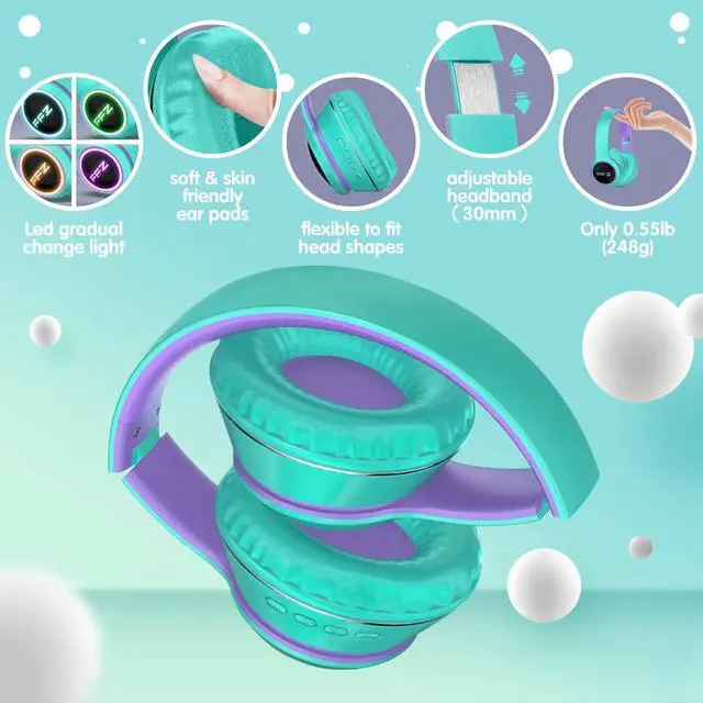Kids Wireless Headphones, Colorful LED Lights Blue Tooth-V5.0 Headphones for Kid with Built-in Microphone, Foldable Headset & Soft Earpads, for School/Car/Airplane/Ipad (Purple)